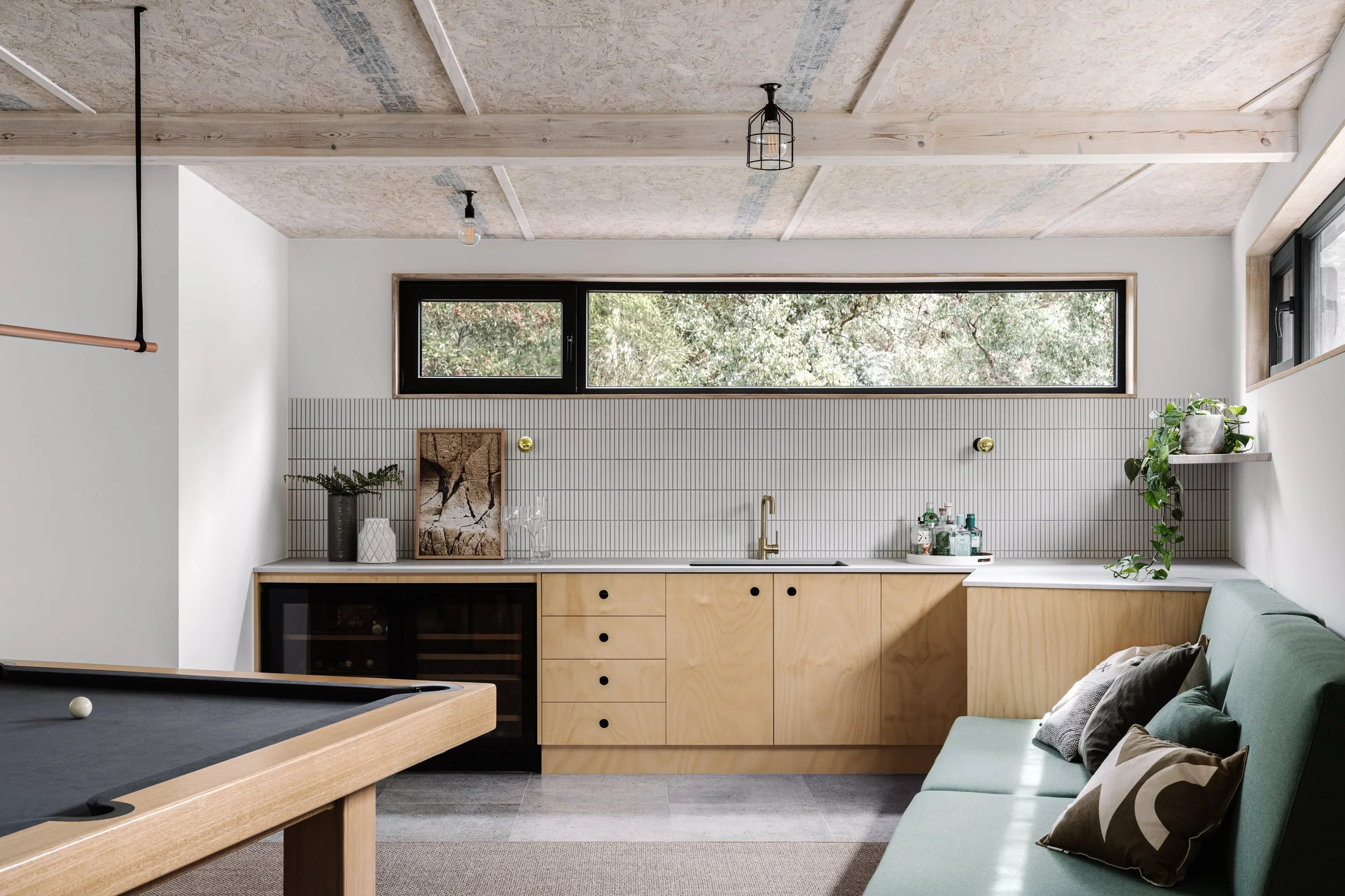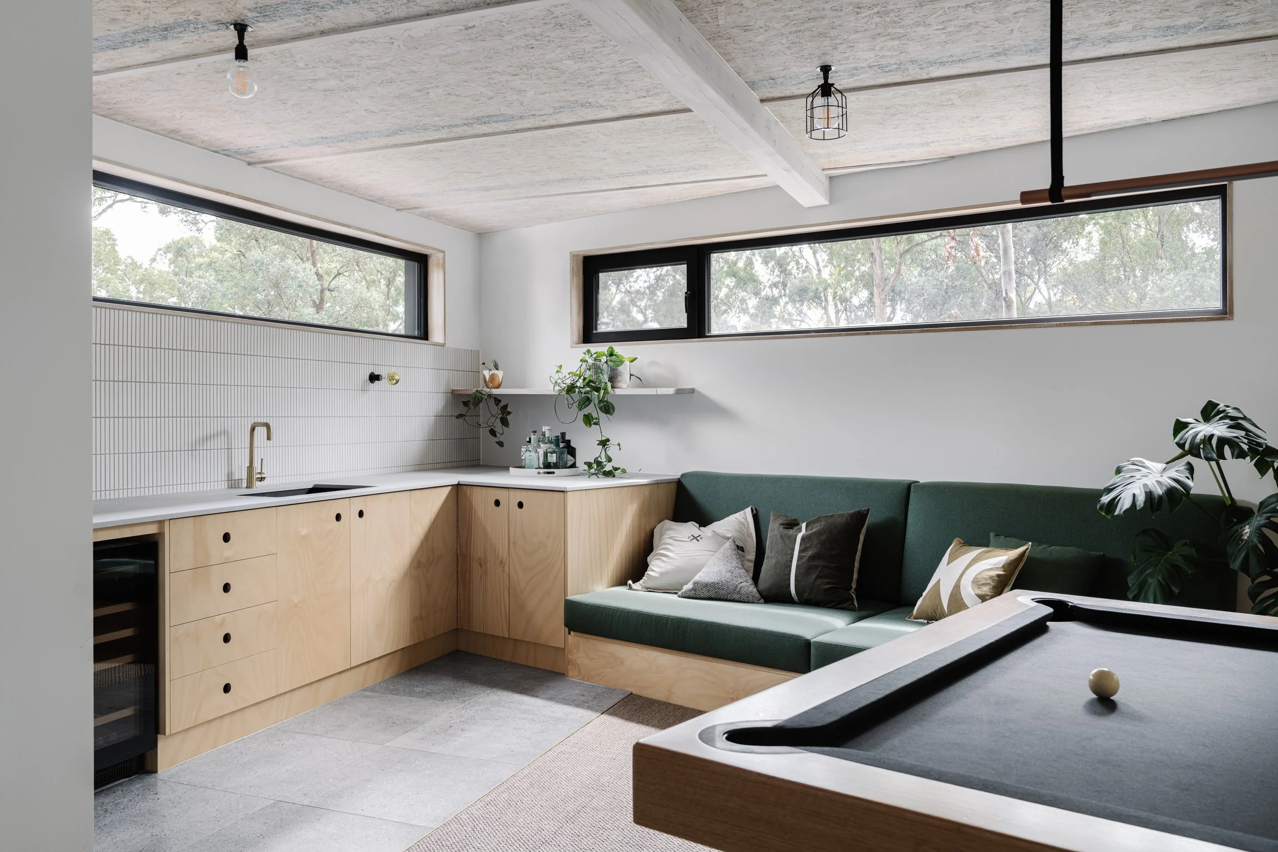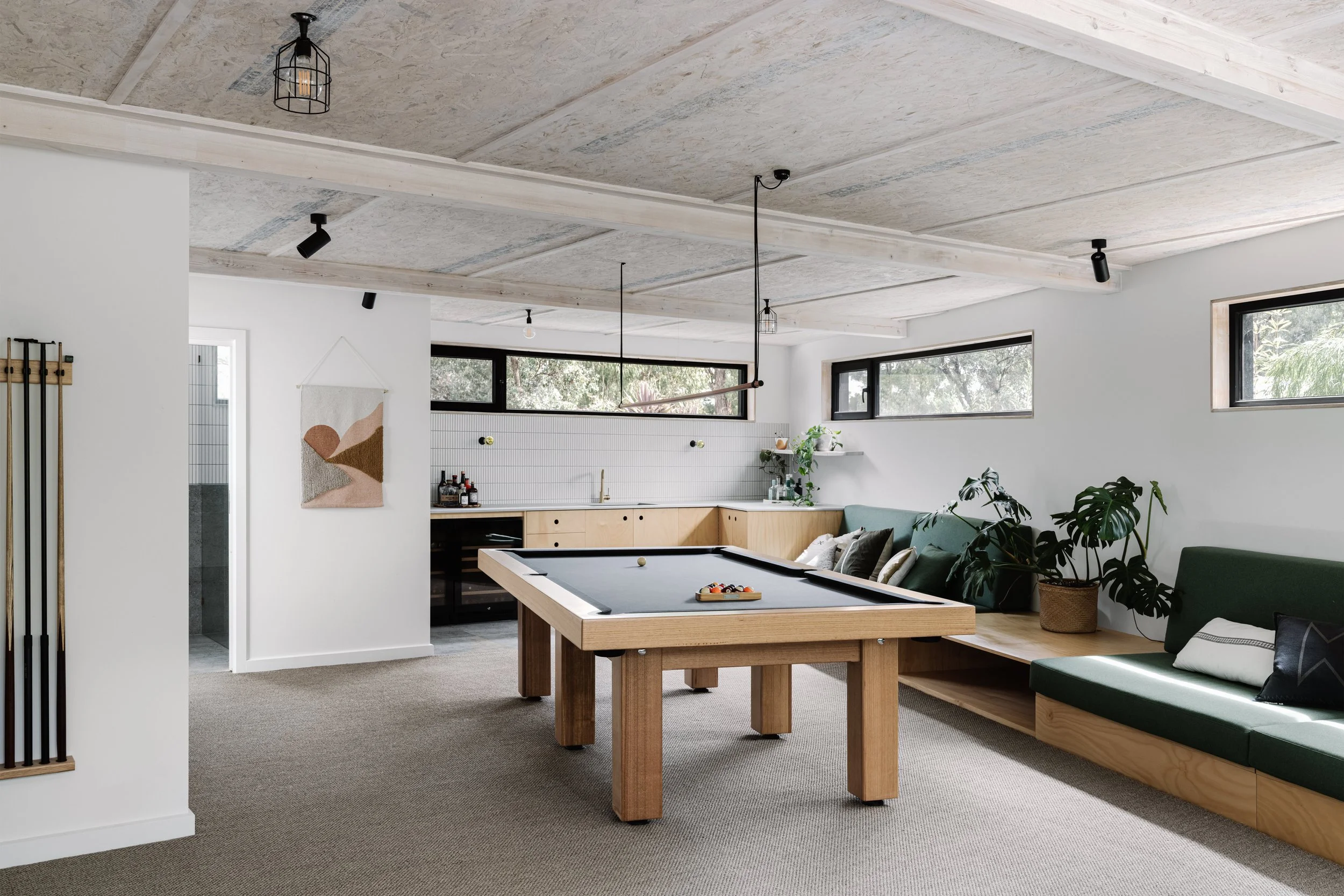 A new extension with a purpose: a multi-purpose games room for the whole family. The centerpiece is the Regent Tasmanian-oak pool/billiard table, complemented by a 'Fjord' ottoman and a Chalkboards coffee table. The lighting, with Pipe pendants and Cage shades, adds a touch of modern industrial charm to the space.