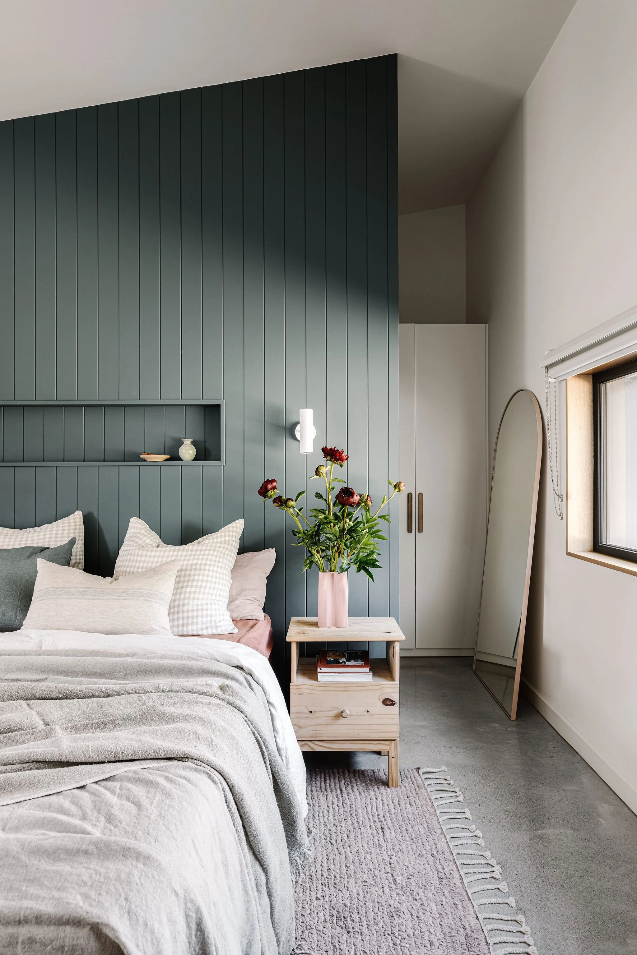 The bed is dressed in soft I Love Linen sheets, creating a welcoming and cozy feel. Underfoot, a textured Armadillo rug adds warmth and an organic touch, while a sculptural vase from Marmoset Found introduces an artistic element.